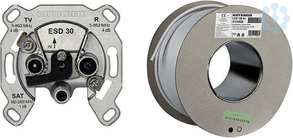 Einzelanschlussdose 3fach, 2 x 5-862 u. 950-2400 MHz, DC-Durchlass ueber SAT-Anschluss, Anschlussdaempfung typ. VHF 3,5 dB, UHF 4 dB, SAT 1 dB, Koaxialkabel, BauPVO EN 50575-Eca, 100 m Einwegspule, 6,8 mm, PVC weiss, Schirmungsmass typ. 130 dB, Klasse A Plus, Metermarkierung, Aufbau typ. 1,02 Cu 4,8 Al CuSn Al, Folie verklebt, KDG Vodafone-Freigabe