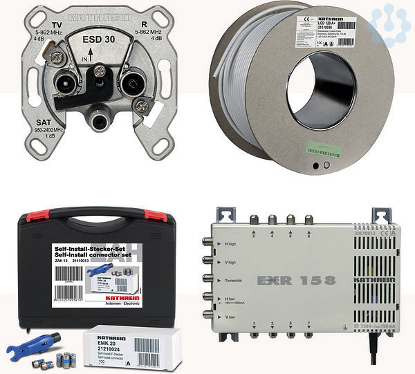 Einzelanschlussdose 3fach, 2 x 5-862 u. 950-2400 MHz, DC-Durchlass ueber SAT-Anschluss, Anschlussdaempfung typ. VHF 3,5 dB, UHF 4 dB, SAT 1 dB, Koaxialkabel, BauPVO EN 50575-Eca, 100 m Einwegspule, 6,8 mm, PVC weiss, Schirmungsmass typ. 130 dB, Klasse A Plus, Metermarkierung, Aufbau typ. 1,02 Cu 4,8 Al CuSn Al, Folie verklebt, KDG Vodafone-Freigabe, Multischalter 5 auf 8, 47-862 4 x 950-2150 MHz, F-Anschluesse, integriertes Netzteil typ. 18 V 550 mA, Anschlussdaempfung typ. SAT 12-7 dB Terr. 4-0 dB,