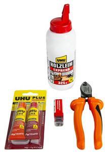 Fasertechnik-Installationskit. Bestehend aus: 1x Schneidwerkzeug zur Kürzung der Faser S0, S2 und S3 1x Bohrersatz bestehend aus 10 Bohrern 1,1 mm für Faser S0 1x Holzleim zur Verklebung von PMMA-Fasern 1x 2-Komponenten-Kleber zur Verklebung von PMMA-Fasern.