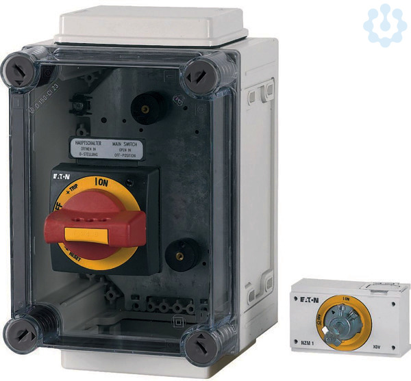 Isolierstoffgehäuse, Kastengröße HxBxT=250x187.5x175mm, für NZM Größe 1, für NZM Baugrösse 1, Schutzklasse 2, schlagfestes Polycarbonat, Schalter-Türkupplungsdrehgriff rot/gelb inklusive, Montageplatte vorgebohrt für Schalter und optionale PE/N-KLemmen, Gehäusedeckel vorbereitet für Drehgriff, Deckel transparent rauchgrau, Wandbefestigungslaschen, inklusive Kabeleinführungsflansch oben und unten.