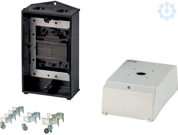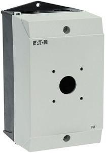 Kleingehäuse, Schutzart IP65, glasfaserverstärktes Polycarbonat, Gehäuseunterteil RAL 9005, schwarz/Gehäuseoberteil RAL 7035, hellgrau, Harte metrische Vorprägungen oben, unten, in der Rückwand, mit vormontiertem Montage-Blech-Schirm, für Schalter T0-../Z, 2 Baueinheiten