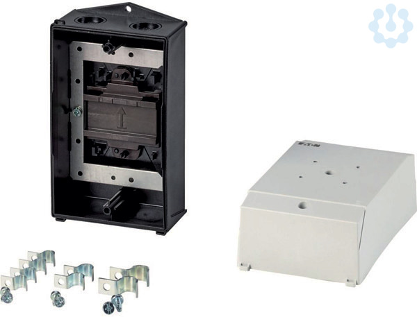 Kleingehäuse, Schutzart IP65, glasfaserverstärktes Polycarbonat, Gehäuseunterteil RAL 9005, schwarz/Gehäuseoberteil RAL 7035, hellgrau, Harte metrische Vorprägungen oben, unten, in der Rückwand, mit vormontiertem Montage-Blech-Schirm, für Schalter T3-../Z, 3- 4 Baueinheiten