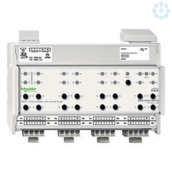 Schneider Electric KNX. Zum unabhängigen Steuern von bis zu 8 Jalousie-/Rollladenantrieben oder zum Schalten von bis zu 16 Verbrauchern über Schließerkontakte. Die Funktion der Jalousie- bzw Schaltkanäle ist frei konfigurierbar. Alle Jalousie/-Schaltausgänge lassen sich mit Tasten manuell betätigen. Anzeige der Kanalzustände über LEDs, eine grüne LED zeigt die Betriebsbereitschaft an. Mit integriertem Busankoppler, Für die Montage auf Hutschienen TH35 nach EN 60715. Der Busanschluss erfolgt über eine Busanschlussklemme, Nennspannung: AC 230 V, 50-60 Hz. Externe Hilfsspannung (optional): AC 110-240 V, 50-60 Hz, max 2 VA Je Jalousieausgang: Nennstrom: 10 A, cos Phi 0,6. Motorlast: AC 230 V, max 1000 W, Je Schaltausgang: Nennstrom: 10 A, cos Phi 1, 10 A, cos Phi 0,6, Glühlampen: AC 230 V, max 2000 W. Halogenlampen: AC 230 V, max 1700 W, Leuchtstofflampen: AC 230 V, max 1800 W, unkompensiert. AC 230 V, max 1000 W, parallelkompensiert. Kapazitive Last: AC 230 V, max 105 uF. Gerätebreite: 12 TE entspricht ca 216 mm. Mit Busanschlussklemme und Leitungsabdeckung. Farbe: lichtgrau.