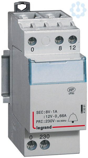 Legrand Klingeltransformator, 2-modulig, Primärspannung 230 VAC, Sekundärspannung AC 12 V/8 V, Nennstrom 0,66 A/1 A, Leistung 8 VA, für Läutewerke, Summer. Klingeltransformator nach EN 61558-2-8, nicht für Dauerlasten geeignet. Integrierter Kurzschluss und Überlastschutz, mit Beschriftungsfenster, Befestigung auf Hutprofilschiene EN 60715 duch rastende Schnellbefestigung.