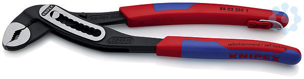 Durchgestecktes Gelenk: hohe Stabilität durch doppelte Führung. Selbstklemmend an Rohren und Muttern: kein Abrutschen am Werkstück, kraftsparendes Arbeiten. Klemmschutz verhindert Quetschverletzungen. Günstige Hebelwirkung: optimale Kraftübertragung. Greifflächen mit spezialgehärteten Zähnen, Härte der Zähne ca. 61 HRC: dauerhaft sicheres Greifen durch hohe Verschleißfestigkeit. Zange mit Befestigungsöse zum Anbringen einer Absturzsicherung Chrom-Vanadin-Elektrostahl, geschmiedet, mehrstufig ölgehärtet