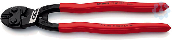 71 01 250 KNIPEX CoBolt® XL für kraftvolles Schneiden auch größerer Querschnitte und sehr harter Materialien. Zweihandbedienung für maximale Schnittkraft. 60 % Kraftersparnis im Vergleich zu herkömmlichen Kraft-Seitenschneidern. 40-fache Handkraftverstärkung durch spezielle Gelenkkonstruktion. Mit Greiffläche unter dem Gelenk zum Greifen und Ziehen von Drähten ab Ø 1,0 mm. Induktiv gehärtete Präzisionsschneiden, Schneidenhärte ca. 64 HRC. gerade Schneiden. - Schneidwerte mittelharter Draht (Durchmesser): Ø 5,6mm - Schneidwerte harter Draht (Durchmesser): Ø 4,0mm - Schneidwerte Pianodraht (Durchmesser): Ø 3,8mm