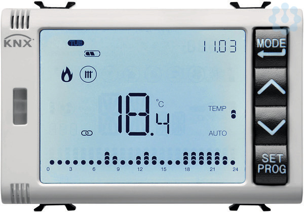 Gebaeudesystemtechnik CHORUS KNX. Chronothermostat mit Feuchtemanagement, mit Wochenprogramm fuer die Steuerung von BUS-Geraeten fuer Heizung/Kuehlung und Befeuchtung/Entfeuchtung. 3 Temperaturprofile (Komfort, Standby, Nacht). Fuer 2- und 4-Rohrsysteme: Zwei-Punkt-Regelung (EIN/AUS oder 0%/100%), proportional-integral (PWM oder stetig), Fan-Coil (max. 3 Stufen). 1 Ausgang fuer die Steuerung des Magnetventils (oder als allgemeiner Ausgang fuer Schalten, zeitgesteuertes Schalten, Zwangsfuehrung oder Szenen); 1 Eingang fuer potenzialfreie Kontakte (fuer Fensterkontakte, Jalousiesteuerung, Dimmen und Szenen); 1 Eingang fuer den externen NTC Fuehler (z.B. fuer den Schutz der Fussbodenheizung) oder Alternativ als zweiter Eingang fuer potenzialfreie Kontakte. 10 frei konfigurierbare Zeitprofile und zwei zusaetzliche Profile reserviert fuer das Chronothermostat, Aufloesung 15-Minuten. Herausnehmbares LCD Display mit anpassbarer RGB Hinterleuchtung. Inbetriebnahme mit ETS. Kombinierbar mit KNX Unterputzthermostaten fuer die lokale Temperatureinstellung. In diesem Fall agiert der Chronothermostat als Master, der die Temperaturprofile an den Bus sendet. Fuer die Gangreserve werden 2 Alkalinebatterie 2 AA benoetigt (nicht im Lieferumfang), die in das herausnehmbare Geraet eigesetzt werden um die Zeiteinstellungen (Datum, Uhrzeit) bei Busspannungsausfall beizubehalten. Das Geraet hat keinen integrierten Feuchtefuehler, die relative Feuchte muss ueber einen externen KNX Fuehler erfasst werden (z.B. GW1x762H).