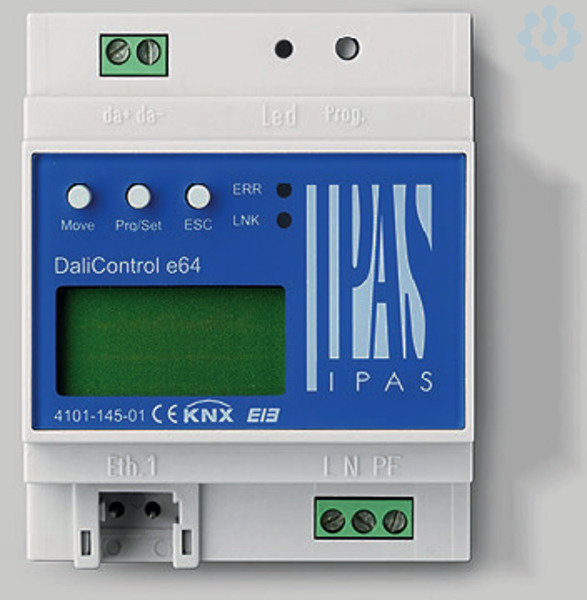 BEGA KNX/DALI-Gateway IPAS 71065 für die Integration von 64 Leuchten mit DALI-Betriebsgerät in eine KNX-Anlage. Parametrierung von 16 DALI-Gruppen, von 16 DALI-Lichtszenen, und von 16 Sequenzen mittels Applikationsprogramm in der ETS Software. Auch die DALI-Farblichtsteuerung von Tunable White und RGBW-Leuchten (DT8, RGBWAF, xy) kann so realisiert werden. Auch für den Betrieb von Notlichteinzel-batterieleuchten mit DALI-Ansteuerung nach DIN EN 62386-202 geeignet.. Modul für die Befestigung auf 35 mm-Hutschiene - DIN 50022, Platzbedarf: 4 TE. Anzahl der DALI-Linien: 1 (max. 64 DALI-Betriebsgeräte). KNX-Anschluss für SELV 24 V DC und Ethernet Anschluss. Parametrierbar via Browser. Abmessungen: 70 x 86 x 58 mm.