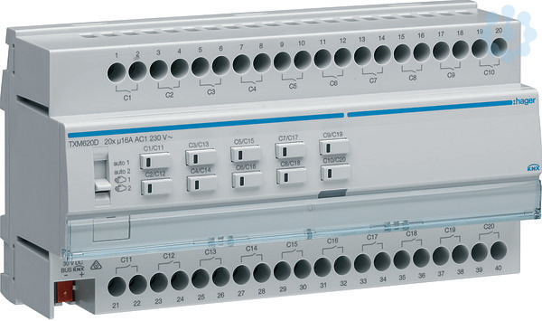 Schalt-/Jalousieaktor 20/10-fach KNX easy, 16A, C-Last. Schalt-/Jalousieaktor REG zum Schalten einer unabhängigen Last je Aktorkanal oder Ansteuerung eines Jalousieantriebes über je zwei Aktorkanäle, beliebiger Mixbetrieb aus Antriebs- und Schaltfunktionen. Reiheneinbaugerät mit integriertem Busankoppler, Steckklemmen für KNX Busanschluss, Last-/Schaltanschlüsse und Beschriftungsfeld. 10 Bedientasten (Schaltkanal 1-10 und Umschaltung auf Kanal 11-20) für Handbetrieb je Ausgang mit Status-LED (Einflächenbedienung). Schiebeschalter Auto/Hand, beleuchtete Programmier-Taste. Funktionen: Steuerungsmöglichkeiten der Schaltkanäle für EIN/AUS, Zeitschalterfunktion mit Ausschaltvorwarnung und Zwangssteuerung mit der jeweiligen Statusanzeige. Automatikfunktion de-/aktivierbar und Lastabwurf durch Kanalabschaltung mit der höchsten Priorität möglich. 64 Szenenfunktionen pro Kanal einstellbar. Rollladen-/Jalousiefunktion im Auf-/Ab-Betrieb mit Lamellenwinkelverstellung, Positionierungsfunktion und Lamellenverstellung für Jalousie in Prozent-Parametrierung. Statusobjekte für die Position der Lamellen in Prozent und der oberen/unteren Endlage. Zwangssteuerung mit Statusanzeige und 3 Alarmobjekte mit unterschiedlicher Prioritätssteuerung. 64 Szenenfunktionen pro Kanal und einstellbarer Sonnenschutzfunktion. Hinweis: Das Gerät lässt sich mittels easy Inbetriebnahme-Tool, easy-Konfigurationsserver oder der ETS (ab Version 4) programmieren. Hinweise der Rollladen-/Jalousiemotoren-Hersteller beachten.