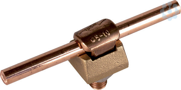 KlemmSchrauben-Verbinder nach DIN EN 62561-1, zum blitzstromtragfähigem Anschluss von Rundleitern z. B. an Flachprofile, Regenrohrschellen oder andere Teile der Blitzschutzanlage. Ausführung einteilig Cu mit Schraube und Mutter M10.