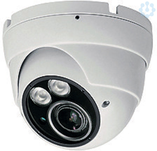 Night & Day-Kugelkamera IP66 mit 2,8 – 12 mm Vario-Objektiv 1/2,9" 2,2 MP CMOS Farbsensor, Auflösung: 1920 x 1080 Pixel, Kamerawinkel: 98° bis 32° horizontal/78° bis 25° vertikal, Stromversorgung: 12 VDC / 460 mA, 2 Hochleistungs-IR-LEDs mit 25 m Beleuchtungsweite, OSD-Menü, 0 Lux bei eingeschalteter LED, Farbe: Weiß, Abmessungen: Ø 119 x 100 mm, 12 VDC-Buchse und BNC-Adapter im Lieferumfang enthalten.