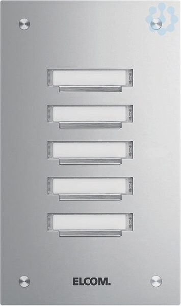 KVM-5/1 Klingelplatte 5/1 UP Edelstahl ESTA. Unterputz Klingeltableau bestehend aus einer 2 mm dicken Frontplatte aus Edelstahl matt gebürstet mit Tasterleiste, Spezialschrauben, flächenbündiges Namensschild (von vorn wechselbar) mit LED-Beleuchtung und UP-Gehäuse 55 mm Tiefe.