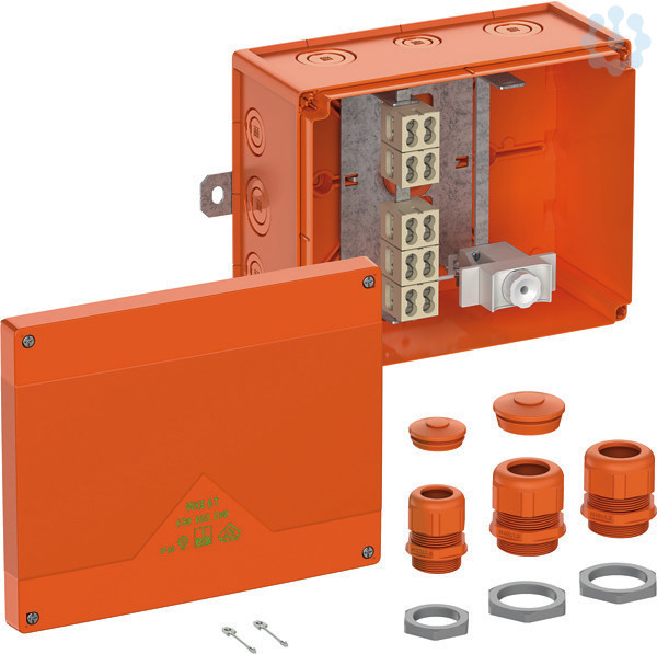 Abzweigkasten, mit Schutzart IP66, Ui=450V AC, zertifiziert durch UL-EU (EN 62208), UL-EU (EN 61439-1/-2), Ausschlagmembranen, M20/M25/M32/M40, (4 rückseitig, 12 seitlich), außenliegende Befestigungsstellen, mit elektrischem Funktionserhalt E30-E90 nach DIN 4102 Teil 12. Druck-Sog-Dicht gemäß Gotthard-Richtlinie. Halogenfreies Gehäuse aus Spezialthermoplast, Klemmen aus hochtemperaturbeständiger Spezialkeramik, Klemmenhalter frei positionierbar, Schnellmontage durch Außenbefestigungslaschen aus Edelstahl 1.4571. Deckelschrauben aus Edelstahl 1.4578, orange, Verbindungskasten 5-polig 1,5-16mm², Abzweigkasten 3-polig 1,5-10mm², Sicherung im Abzweig 1 x Sockel D01 (ohne Einsatz), Anzahl der klemmbaren Leiter pro Klemmstelle 5 x 1,5² / 4 x 2,5² / 2 x 4² / 2 x 6² / 1 x 10² / 1 x 16²