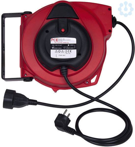 Kabelaufroller 10m H05VV-F 3G1,5 IP24; BxHxT =160x260x310mm; mit Schutzkontaktstecker und -kupplung; mit Überlastschutz und abschaltbarer Blockiervorrichtung; Nennaufnahme: aufgerollte Leitung 800W; abgerollte Leitung: 2000W; Zuleitung: ca. 1,3m; Gehäuse: rot; TÜV/GS - geprüft