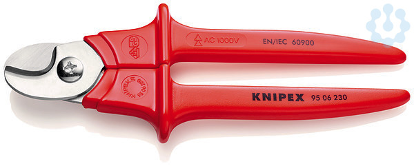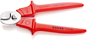 95 06 230 Kabelschere Nicht für Stahldraht und hartgezogene Kupferleiter geeignet. Gehärtete Schneiden mit Präzisionsschliff. Kein Quetschen, geringe Verformung des Kabels. Nachstellbares Schraubgelenk. für Cu-Leiter eindrähtig bis 16 mm², mehrdrähtig bis 50 mm² und feindrähtig bis 70 mm²; für Al-Leiter mehrdrähtig 70 mm². leichter Schnitt bei Einhandbedienung durch hohe Übersetzung. rostfreier Spezialstahl, gehärtet und angelassen. - Schneidwert Cu-Kabel, mehrdrähtig: 50mm² - Schneidwert Cu-Kabel, mehrdrähtig: Ø 16mm - AWG: 1 / 0 - VDE-geprüft: Ja