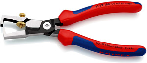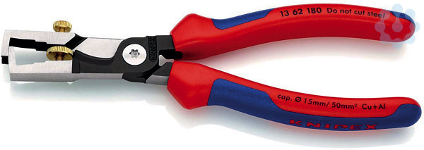 13 62 180 KNIPEX StriX® Abisolierzange mit Kabelschere – zwei unentbehrliche Werkzeuge der Elektroinstallation in einer Zange. Integrierte Kabelschere zum sauberen, quetschfreien Schneiden von Cu- und Al-Kabeln. Schneiden zusätzlich induktiv gehärtet, Schneidenhärte ca. 57 HRC. Universelle Einstellung der Abisoliermesser durch eine Rändelschraube. Schlanke Bauform für gute Zugänglichkeit. Abisolieren von ein-, mehr- und feindrähtigen Leitern mit Kunststoff oder Gummiisolation bis max. Ø 5 mm bzw. 10 mm² Leiterquerschnitt. Optische Orientierungshilfe zum Abisolieren gängiger Längen (11 mm und 16 mm) durch Abstufung in der Backe. - Schneidwert Cu-Kabel, mehrdrähtig: 50mm² - Schneidwert Cu-Kabel, mehrdrähtig: Ø 15mm - Abisolierwerte Quadratmillimeter: 10,0mm² - Abisolierwerte (Durchmesser): Ø 5,0mm - AWG: 8