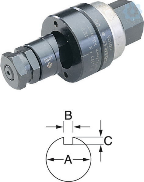 Geeignet für Stahlblech (St37), Kunststoff und Aluminium bis zu 1,5 mm Stärke. Betätigung manuell und hydraulisch, Komplettsystem bestehend aus Stempel, Matrize, Zugschraube, Kontermutter und Kugellagermutter. Vorbohren mit Durchmesser 23,8 mm Vorbohrer 50300083.