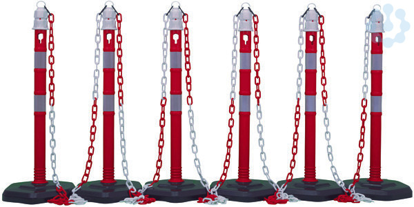 Kettenständer aus Kunststoff, Rot-Weiss reflektierend. Das Kettenständer-Set sorgt für mobile Absperrungen, kippstabil, bis zu 4 m Pfostenabstand möglich. Das Set besteht aus 4 oder 6 Pfosten inkl. Ketten und Haken. Ein schwerer Kunststoff-Sechseckfuß sorgt für einen festen Stand. Die Kunststoffpfosten haben eine Höhe von 1000 mm, das Rohr-Ø beträgt 63 mm und ein Antirutschelement schont den Untergrund. Ausführung: 6 Pfosten, 5 Ketten á 3 m; Maße: Ø 370 mm, Höhe 75 mm.