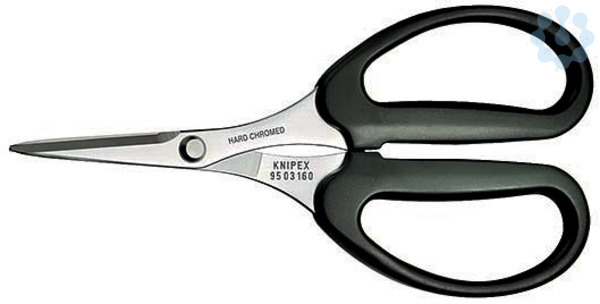 95 03 160 SB Schere Nur zum Schneiden von Fasern aus KEVLAR® in LWL-Kabeln, nicht für andere Werkstoffe benutzen. Präzisionsschliff mit Zähnen verhindert ein Rutschen der Fasern und garantiert einen sauberen Schnitt. Genietetes Präzisionsgelenk für reibungsarmen Gang und klemmfreien Schnitt der dünnen Fasern. Hartverchromte, geschliffene Oberfläche. KEVLAR® ist ein eingetragenes Warenzeichen der E. I. du Pont de Nemours and Company.