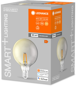 Klassische Globe-Form mit Glühwendel-Design mit WiFi-Technologie. Produkteigenschaften: Steuerbar über LEDVANCE SMART+ WiFi App (mit mindestens Android™️ 4.4 oder iOS 9.0). Steuerung über Google Assistant oder Amazon Alexa möglich. Netzwerkprotokoll: WiFi. Dimmbar. Lebensdauer: bis zu 15.000 h. Produktvorteile: Drahtlose Steuerung über App. Einfache Installation und Nutzung. Enthält kein Quecksilber. Anwendungsgebiete: Allgemeinbeleuchtung. Wohnräume. Gewerbe (Hotels, Bars, Boutiquen usw.). Einsatz im Außenbereich nur in geeigneten Außenleuchten.