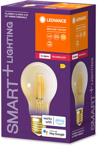 Klassische Kolbenform mit Glühwendel-Design mit Zigbee-Technologie. Produkteigenschaften: LED-Classic-A-Lampe mit intelligenter kabelloser Steuerungstechnik. Dimmbar. Netzwerkprotokoll: ZigBee. Lebensdauer: bis zu 15.000 h. Steuerung über kompatibles Smart-Home-System (Gateway und App) oder SMART+ Switch. Für vollen Funktionsumfang Verbindung mit einem kompatiblen Smart Home System (Gateway und App) notwendig. Produktvorteile: Einfache Installation und Nutzung. Energieeinsparung von bis zu 90 % (gegenüber Halogenlampen). Enthält kein Quecksilber. Anwendungsgebiete: Allgemeinbeleuchtung. Außenanwendungen nur in geeigneten Leuchten. Technische Ausstattung: Steuerung über App erfordert LIGHTIFY-System (App und Gateway) oder anderes kompatibles Smart-Home-System.