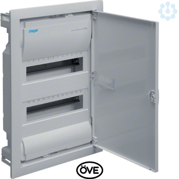 Kleinv.,Volta,UPV,2x12PLE,IP30,Stahlbl.tür,340x335x90mm Nischenmaß. Installationskleinverteiler Unterputz aus Kunststoff, nach OVE EN 60670-24, geeignet zum Einsatz in Wohngebäuden nach ÖVE E 8001 - Reihe und OVE E 8101. Zum Einbau von Geräten bis 63 A mit 70 mm Einbautiefe nach Maßnorm DIN 43880, Bemessungsspannung 400V/50Hz. Schutzart IP30, Schutzklasse II schutzisoliert. Bestehend aus: Kunststoff-Mauerkasten mit serienmäßigem Leitungsabfang und ausbrechbaren Leitungseinführungsschiebern mit Schnappbefestigung, integrierter Wasserwaage und verzinkten Stahlblech-Befestigungslaschen. Geräteträger aus verzinktem Stahlblech, Hutschienen einzeln isoliert einbaubar. Geräteabdeckung aus Kunststoff mit 46 mm Geräteschlitz, Schnellverschlussbefestigung mit 90° Drehung, serienmäßig plombierbar. Verdrehbarer Blendrahmen mit Tür aus Stahlblech, pulverbeschichtet und eingebrannt, mit 15 mm Putzausgleich. Tür, frontbündig mit innenliegenden handbedienbaren Scharnieren. Türverschluss mit frontbündiger Griffmulde und selbsttätig zurückklappendem Griff, Türanschlag rechts oder links ohne Blendrahmendemontage. Serienmäßige Schaltplanbefestigung in der Tür und integrierter seitlicher Leitungsführungskanal mit Kabelhalteklammern. Fingersichere PE/N-Klemme mit Stecktechnik in montagefreundlicher Schnapptechnik und N-Klemme für FI-Kreise serienmäßig.