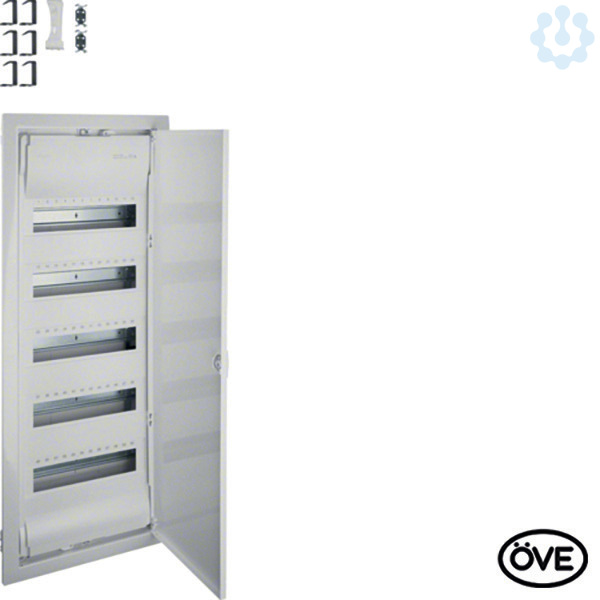 Kleinv.,Volta,UPV,5x12PLE,IP30,Stahlbl.tür,865x335x90mm Nischenmaß. Installationskleinverteiler Unterputz aus Kunststoff, nach OVE EN 60670-24, geeignet zum Einsatz in Wohngebäuden nach ÖVE E 8001 - Reihe und OVE E 8101. Zum Einbau von Geräten bis 63 A mit 70 mm Einbautiefe nach Maßnorm DIN 43880, Bemessungsspannung 400V/50Hz. Schutzart IP30, Schutzklasse II schutzisoliert. Bestehend aus: Kunststoff-Mauerkasten mit serienmäßigem Leitungsabfang und ausbrechbaren Leitungseinführungsschiebern mit Schnappbefestigung, integrierter Wasserwaage und verzinkten Stahlblech-Befestigungslaschen. Geräteträger aus verzinktem Stahlblech, Hutschienen einzeln isoliert einbaubar. Geräteabdeckung aus Kunststoff mit 46 mm Geräteschlitz, Schnellverschlussbefestigung mit 90° Drehung, serienmäßig plombierbar. Verdrehbarer Blendrahmen mit Tür aus Stahlblech, pulverbeschichtet und eingebrannt, mit 15 mm Putzausgleich. Tür, frontbündig mit innenliegenden handbedienbaren Scharnieren. Türverschluss mit frontbündiger Griffmulde und selbsttätig zurückklappendem Griff, Türanschlag rechts oder links ohne Blendrahmendemontage. Serienmäßige Schaltplanbefestigung in der Tür und integrierter seitlicher Leitungsführungskanal mit Kabelhalteklammern. Fingersichere PE/N-Klemme mit Stecktechnik in montagefreundlicher Schnapptechnik und N-Klemme für FI-Kreise serienmäßig.