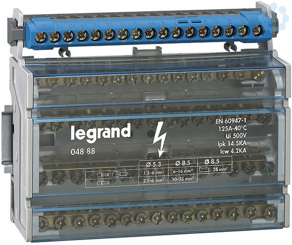 Legrand Klemmenblock, 4-polig, 125 A, Anzahl der Klemmstellen: 15, nach EN 60947-1, Isolationsspannung 500 V nach EN 60947-1/IEC 60664-1, Bemessungsstoßspannung Uimp 8 kV, Bemessungskurzschlussstrom Isc peak 14,5 kA, mit rückseitiger Isolierung und transparentem Schutzdeckel vorne, Isolationsschutz zwischen den einzelnen Klemmenschienen, Befestigung wahlweise auf Hutprofilschiene EN 60715 oder mit 2 Schrauben auf Montageplatte, Kennzeichnungsmöglichkeit jeder Klemmenreihe mit Kennzeichnungssystem CAB 3, zusätzlicher Anbau von Klemmenleisten IP 20 möglich. Modulbreite 8 Teilungseinheiten.