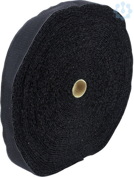 Klettband, aus schwarzem, extrudiertem Polyamid-Velours-Laminat, Dicke ca. 1, 4 mm, selbsthaftend back to back, geeignet für ca. 200 Betätigungen, außer der Standardfarbe schwarz ist lieferbar weiß, rot, blau, grün, gelb. Mindestabnahme bitte anfragen, Lieferzeit ca. 8 Wochen, Klettbinder-Rollenware, Rolle 25 m Länge für individuellen Zuschnitt auf gewünschte Länge