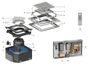 Isolierte Kondensatwanne aus Kunststoff und innen liegende Kondensatpumpe mit max. Förderhöhe von 1000 mmWS. Automatischer Pumpenbetrieb mit Nachlauf während des Kühlbetriebes, Sicherheitsabschaltung durch Schwimmerschalter bei zu großen Kondensatmengen. Kondensatanschluß seitlich am Gerät innerhalb der Zwischendecke. Elektrischer Schaltkasten mit Anschlußklemmen seitlich am Gerät innerhalb der Zwischendecke.