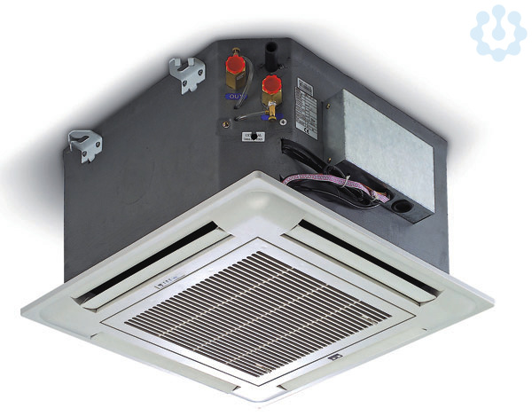 Kaltwasser-Deckenkassette zur Montage in Zwischendecken mit Euroraster-Abmessungen im Zwei-Leiter-System zum Anschluß externer Regelungen.