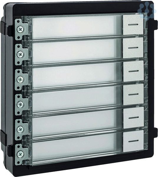 Das Klingeltasten-Modul erweitert das ModuVis-System (Videomodul und ggf. weitere Module) um 6 Klingeltasten, z. B. zur Ausstattung eines Mehrfamilienhauses. Die Tasten sind hintergrundbeleuchtet, Blenden zur Abdeckung nicht benötigter Tasten liegen bei.