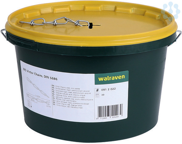 30 Meter lange Knotenkette nach DIN 5686 aus elektrolytisch verzinktem Stahl im praktischen Kunststoffeimer mit Ausschnitt im Deckel zum einfachen Lagern und Entnehmen, Kettengliedlänge innen 28, Kettengliedbreite innen 5 Millimeter.