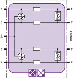 Platzsparendes Kombiableiter-Modul mit LifeCheck zum Schutz von 2 Doppeladern erdpotentialfreier hochfrequenter Bussysteme oder Videoübertragungen. LifeCheck erkennt thermische oder elektrische Überlastzustände nach denen der Ableiter auszutauschen ist. Die Anzeige erfolgt berührungslos mittels DEHNrecord LC / SCM / MCM.