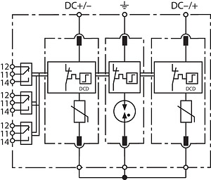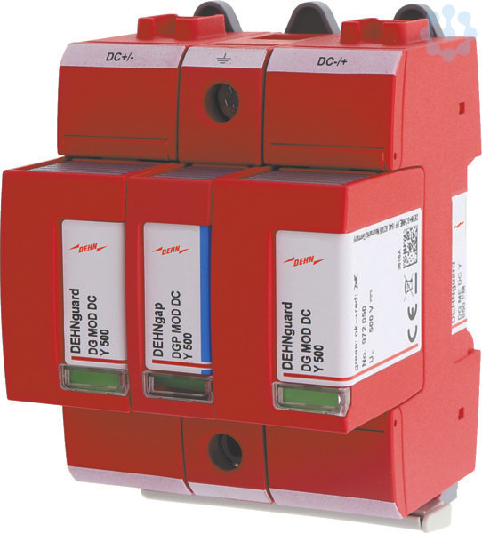 Dreipoliger, modularer, steckbarer Kombi-Ableiter Typ 1+2 DEHNguard ME DC Y 950 FM für Gleichstromanwendungen mit mechanische Funktions-/Defektanzeige und UL Zulassung. Ableiter Typ 1+2 analog zu EN 61643-11, Y-Schaltung bestehend aus leckstromfreier Varistor-Gasableiter -Technologie. Speziell für den Einsatz in DC-Stromkreisen bis 950 V geeignete DC-Schaltvorrichtung DCD.