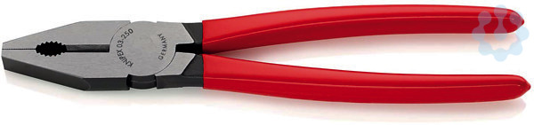 03 01 250 EAN Kombizange Mit Greifzonen für Flach- und Rundmaterial für vielseitigen Einsatz. Mit Schneiden für weichen und harten Draht. Lange Schneiden für dickere Kabel. Schneiden zusätzlich induktiv gehärtet, Schneidenhärte ca. 60 HRC. - Schneidwerte mittelharter Draht (Durchmesser): Ø 3,8mm - Schneidwerte harter Draht (Durchmesser): Ø 2,5mm - Schneidwert Cu-Kabel, mehrdrähtig: Ø 15,0mm - Schneidwert Cu-Kabel, mehrdrähtig: 25,0mm²