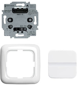 Einbaufertige Bewegungsmelder-Tastschalter-Kombination (Set-Verpackung). Bestehend aus Busch-Komfortschalter® Bedienelement flex, 64765-214. Bestehend aus Relais-Einsatz flex, 1-fach 64811 U. Bestehend aus Reflex SI-Abdeckrahmen, 1-fach, 2511-214. Die Reichweitenangaben beziehen sich auf eine Umgebungstemperatur von 21 °C. Nur in Verbindung mit handelsüblichen UP-Gerätedosen nach DIN 49073, Teil 1 montieren oder Busch-Jaeger Art.-Nr. 3040 UP-Dose Mauerwerk, 3050 UP-Dose Hohlwand oder 3060 UP-Dose Beton)