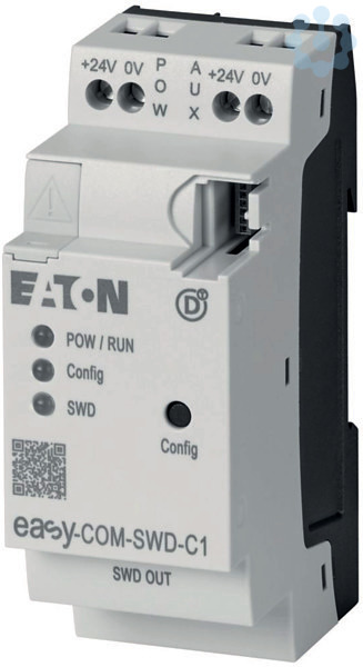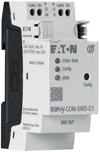 Mit dem Kommunikationsmodul EASY-COM-SWD-C1 kann ein SmartWire-DT Strang von bis zu 99 Teilnehmern mit einem Steuerrelais der Serie easyE vernetzt werden. Durch diese intelligente Vernetzung der Komponenten auf der Feldebene ist es möglich über das Steuerrelais easy alle Teilnehmer am Kommunikationssystem SmartWire-DT zu parametrieren, zu überwachen und zu steuern. Die Anschlüsse erfolgen per Schraubklemme.