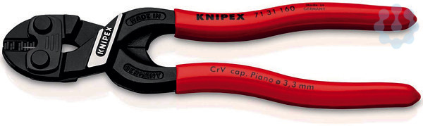 71 31 160 KNIPEX CoBolt® S Hochbelastbare Schneide mit Aussparung trennt härteste Rundmaterialien in nur einem Schneidvorgang. Extrem hohe Schneidleistung in handlicher 160 mm Länge. Kleiner, schlanker Kopf für sehr gute Zugänglichkeit. Kompakt und leistungsstark: schneidet Bolzen, Nägel, Niete usw. bis Ø 4,8 mm. Schneidenhärte ca. 64 HRC. Geringerer Kraftaufwand durch effiziente Übersetzungsmechanik. Vermindertes Wegrutschen des Schneidmaterials durch gelaserte Schneide. Mit Greiffläche unter dem Gelenk zum Greifen und Ziehen von Drähten ab Ø 1,0 mm. Schneiden mit Aussparung für leichteres Schneiden von größeren Querschnitten durch besseren Hebeleffekt in Drehpunktnähe. - Schneidwerte weicher Draht (Durchmesser): Ø 5,3mm - Schneidwerte mittelharter Draht (Durchmesser): Ø 4,8mm - Schneidwerte harter Draht (Durchmesser): Ø 3,6mm - Schneidwerte Pianodraht (Durchmesser): Ø 3,3mm