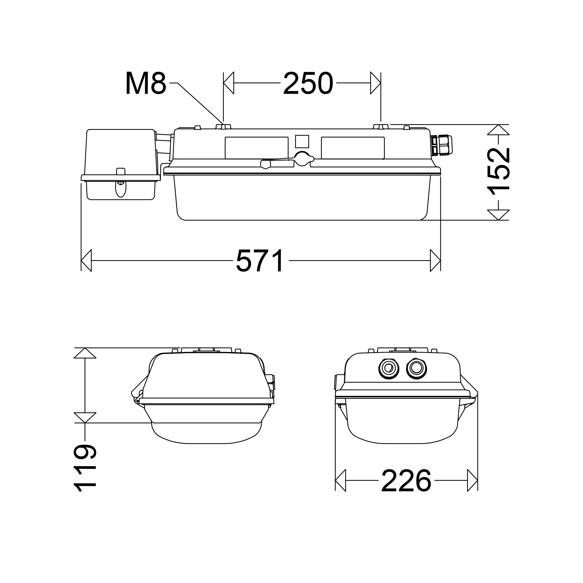 EX-LED-Notleuchte, EX-Zone 1/21/2/22, 19 W, 2050 lm, Einzelbatterie, Selbsttest, Brenndauer 3 h, SKI, IP66, breitstrahlend, 6500 K, Ra≥ 80, Ta -30 °C/+55 °C, L80B50>100000 h (@ Ta max), L80B50>100000 h (@ Ta 25°C), L90B50>90000 h (@ Ta 25°C), Wanne PC satiniert, Verschluss Kunststoff, Gehäuse glasfaserverstärktes Polyester, Farbe grau, Rein-Raus-Verdrahtung (RR), EAN/GTIN:4041254312675.Kompakte explosionsgeschützte LED-Notleuchte mit Zentralverschluss für Zone 1/21 und hohe Umgebungstemperaturen. Glasfaserverstärktes Polyestergehäuse, satinierte Abschlusswanne aus Polycarbonat mit Silikondichtung. Aluminiumreflektor lackiert mit vergossenen LED-Modulen und Schutzabdeckung, abklapp- und herausnehmbar. Gekapseltes EVG mit integrierter Notlichtelektronik und automatischer Funktionsüberwachung gemäß EN 62034 mit optischer Anzeige der Prüfergebnisse. An der Stirnseite der Leuchte angebauter Batteriekasten mit NiCd-Batterie, elektronischem Ladesystem, Tiefentladeschutz nach EN 61347-2-7, kurzschlussfestem Akku-Anschluss und Verpolungsschutz. Wiederaufladezeit 24h nach EN 60598-2-22. Details siehe „Technische Daten“.