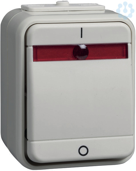 Kontroll-Ausschalter 2-polig, 10 A 250V AC. Farbe: perlweiß, mit lichtintensiver Glimmlampe, für Aufputzmontage. Schutzart IP 44, mit zwei Leitungseinführungen, Steckklemmen: Klemmbereich für Informationsleitungen ab Leitungsdurchmesser 0,5mm, für Kupferleiter 1,5 mm und 2,5 mm.