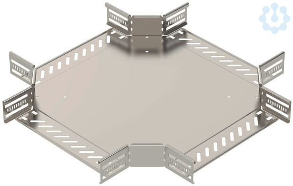 Kreuzung zum Erstellen einer horizontalen Abzweigung, Formteil für rast- und schraubbare Kabelrinnen Seitenhöhe 60 mm. Schraubenlose Montage mit Doppelklemmen oder Schraubverbindung mit Flachrundschrauben FRS und Kombimuttern M6. Einsetzbar im Innen- und Außenbereich. Befestigungsmaterial muss separat bestellt werden.