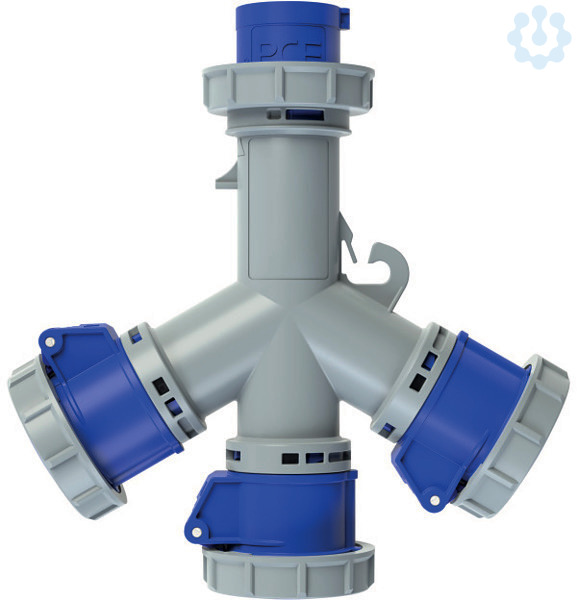 CEE Mehrfachsteckdose 16A 3p 6h mit Stecker IP67; Gehäusematerial: PC/ABS; Nennstrom: 16A; Polzahl: 3 (2P+PE); Uhrzeit-Stellung: 6h; Nennspannung/Frequenz: 200-250V~ / 50+60Hz; Kontakte: Messing vernickelt; Eingang: 1x CEE-Stecker 16A 3p 6h; Ausgang: 3x CEE-Dosen 16A 3p 6h; fertig verdrahtet; Schutzart: IP67