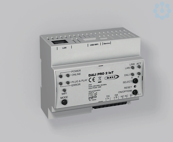 DALI-2-zertifizierter Controller zum Steuern von bis zu 128 DALI-Leuchten (2 DALI Linien à 64 DALI Betriebsgeräte) und 126 Eingabegeräten (Sensoren und Tasterkoppler). Integrierte DALI-Stromversorgung (200 mA je DALI-Linie). Möglichkeit bis zu 8 Controller über ein Ethernet-Netzwerk zu vernetzen, um bis zu 1024 DALI-Betriebsgeräte steuern zu können. Cloud-Anbindung/Datenfernzugriff über integriertes IoT-Gateway möglich. Integration in Gebäudemanagementsystem KNX über optional erhältliches KNX-Gateway. Inbetriebnahme per LAN oder WLAN möglich. Zur Montage auf DIN-Schiene (6TE). Gehäuse Kunststoff.