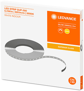 LED-Bänder mit 500 lm/m für professionelle Anwendungen mit sehr guter Farbwiedergabe und Lebensdauer. Produkteigenschaften: Flexibles und teilbares LED-Band. Kleinste teilbare Einheit: 50 mm. Lebensdauer (L80/B10): bis zu 60.000 h bei Tp: 45°C. Lichtstrom: 500 lm/m. Sehr gute Farbwiedergabeindex Ra: > 90. Anfängliche Farbkonsistenz: ≤ 3 SDCM (Schwellwerteinheit). Großes Spektrum an Farbtemperaturen: von Warmweiß bis kühles Tageslicht. IESNA LM79-, LM80 konform. Dimmbar mit geeigneten Treibern, siehe auch www.ledvance.de/dim ). Produktvorteile: Große Designfreiheit dank langer, flexible LED-Lichtbänder. Einfache Installation, werkzeugloser Anschluss. Einfache Montage an vielen glatten Oberflächen durch selbstklebendes Klebeband. Maximale Flexibilität dank großer Auswahl an Zubehör. Einfacher Anschluss durch beidseitig integrierte Kabel. Anwendungsgebiete: Allgemeine Innenbeleuchtung. Industrie. Büros, Verkaufs- und Konferenzräume. Architekturbeleuchtung. Dekorative Beleuchtung. Technische Ausstattung: Verbindungen, Profile und Abdeckungen für verschiedene Montagemöglichkeiten verfügbar.