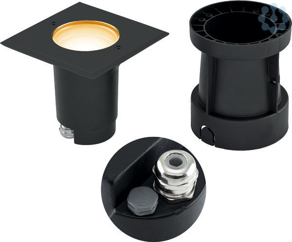 Der Leuchtenkörper ist aus Aluminium, die Abdeckplatte hingegen aus V2A-Edelstahl gefertigt. Die Kabeleinführung erfolgt über die am Boden befindliche Kabelverschraubung, welche für Kabel bis 9mm Durchmesser geeignet ist. Zur Vermeidung von Kondenswasser befindet sich auf der Unterseite der Leuchte ein selbstentlüftendes Entlüftungsventil. Es besteht die Möglichkeit, die Leuchte ohne den im Lieferumfang enthaltenen Kunststoff-Einbautopf zu montieren, in diesem Fall beträgt der Lochausschnitt 96mm während die Einbautiefe unverändert bleibt. Das mitgelieferte GU10-LED-Leuchtmittel kann bei Bedarf jederzeit ausgetauscht werden. Der Schwenkwinkel beträgt 10°. Zusätzlich ist ein mattes Schutzglas im Lieferumfang enthalten.
