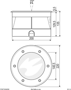 Der Leuchtenkörper der Bodeneinbauleuchte ist aus massivem Aluminium gefertigt, der obere Abdeckring hingegen aus V2A-Edelstahl und kann für vielfältige Anwendungen im Außenbereich verwendet werden. Die Montage erfolgt mittels der im Lieferumfang befindlichen Kunststoff-Einbauhülse. Da der COB-LED-Chip fest verbaut ist, fallen keine zusätzlichen Kosten für Leuchtmittel an. Ebenso entstehen auch keine zusätzlichen Kosten für ein Vorschaltgerät, da der Anschluss direkt an die 230V-Zuleitung erfolgt. Die maximale Überfahrgeschwindigkeit beträgt 20km/h. Optional sind für die Leuchte ein mattes Glas erhältlich. Die Leuchte hat eine 0,50m lange Anschlussleitung (ÖLFLEX CLASSIC 110 BLACK 3 x 0,75mm²) mit freien Aderenden. Der Ausstrahlwinkel beträgt 60°.