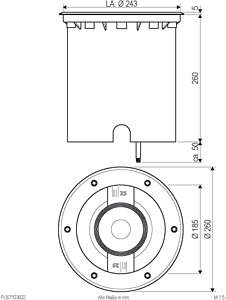 Der Leuchtenkörper der Bodeneinbauleuchte ist aus massivem Aluminium gefertigt, der obere Abdeckring hingegen aus V2A-Edelstahl und kann für vielfältige Anwendungen im Außenbereich verwendet werden. Die Montage erfolgt mittels der im Lieferumfang befindlichen Kunststoff-Einbauhülse. Über eine Justierschraube auf der Unterseite der Leuchte wird der gewünschte Schwenkwinkel eingestellt, somit muss die Leuchte selbst nicht geöffnet werden. Außerdem entstehen auch keine zusätzlichen Kosten für ein Vorschaltgerät, da der Anschluss direkt an die 230V-Zuleitung erfolgt. Zur Vermeidung von Kondenswasser befindet sich auf der Unterseite der Leuchte ein selbstentlüftendes Entlüftungsventil. Die Leuchte hat eine 0,50m lange Anschlussleitung (ÖLFLEX CLASSIC 110 BLACK 3 x 0,75mm²) mit freien Aderenden. Die maximale Überfahrgeschwindigkeit beträgt 20km/h. Der Ausstrahlwinkel beträgt 23°. Der Schwenkwinkel beträgt 25°.