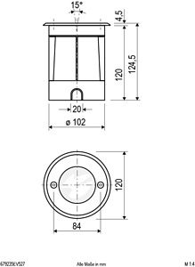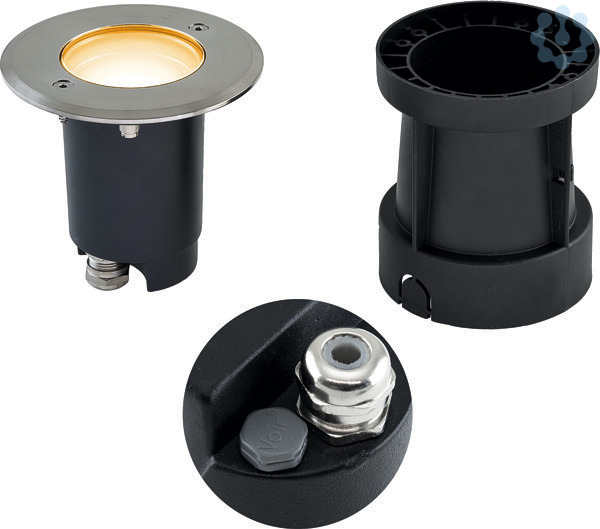 Der Leuchtenkörper ist aus Aluminium, die Abdeckplatte hingegen aus V2A-Edelstahl gefertigt. Die Kabeleinführung erfolgt über die am Boden befindliche Kabelverschraubung, welche für Kabel bis 9mm Durchmesser geeignet ist. Zur Vermeidung von Kondenswasser befindet sich auf der Unterseite der Leuchte ein selbstentlüftendes Entlüftungsventil. Es besteht die Möglichkeit, die Leuchte ohne den im Lieferumfang enthaltenen Kunststoff-Einbautopf zu montieren, in diesem Fall beträgt der Lochausschnitt 96mm während die Einbautiefe unverändert bleibt. Das mitgelieferte GU10-LED-Leuchtmittel kann bei Bedarf jederzeit ausgetauscht werden. Die maximale Überfahrgeschwindigkeit beträgt 20km/h, der Schwenkwinkel beträgt 10°. Zusätzlich ist ein mattes Schutzglas im Lieferumfang enthalten.