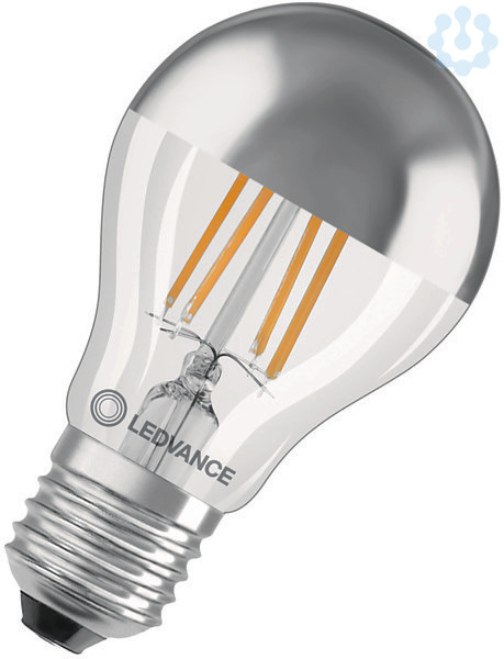 LED-Lampen, klassische Kolbenform, mit Spiegel-Kolbenkrone. Produkteigenschaften: Verspiegelung der Kolbenkuppe: Gold oder Silber. Lampe aus Glas. Gute Lichtqualität; Farbwiedergabeindex Ra: ≥ 80; konstanter Farbort. Produktvorteile: Lange Lebensdauer von bis zu 15.000 h. Geringer Energieverbrauch. Einfacher Lampenwechsel dank kompaktem Design. Sofort 100 % Licht, keine Aufwärmzeit. Lampen mit innovativer LED-"Filament"-Technologie. Anwendungsgebiete: Ideal für dekorative Einbauten. Spiegelbeleuchtung. Anwendungen im Haushalt. Allgemeinbeleuchtung. Einsatz im Außenbereich nur in geeigneten Außenleuchten.